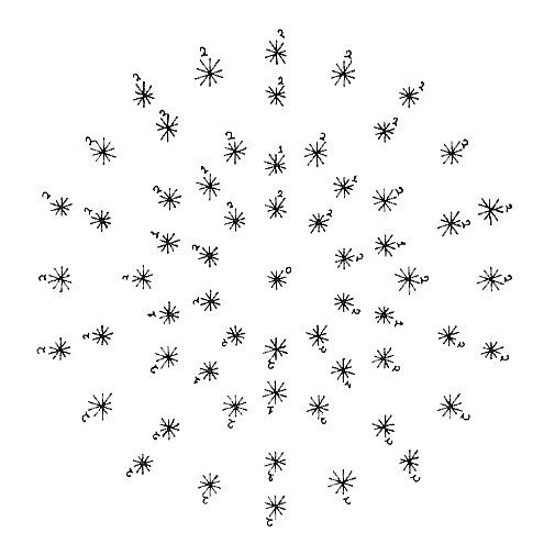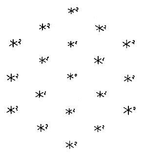 Below, we have three different patterns. Each has been produced by a different star following the same rule of growth. In one case, the pattern is that of squares, in other triangles and in the largest a strange pattern of over-lapping pentagons and five pointed stars.