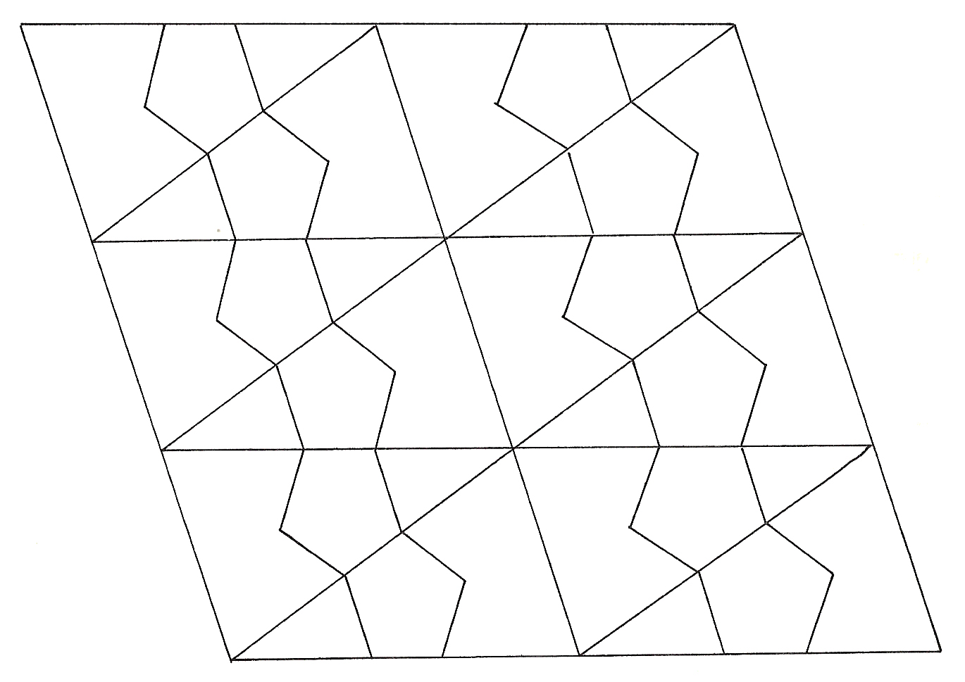 In the case of the pattern with five-fold symmetry, there isn’t uniformity. Different points have different patterns in their immediate neighborhoods. Instead of the pattern simply reproducing itself across the page, it becomes steadily more intricate.