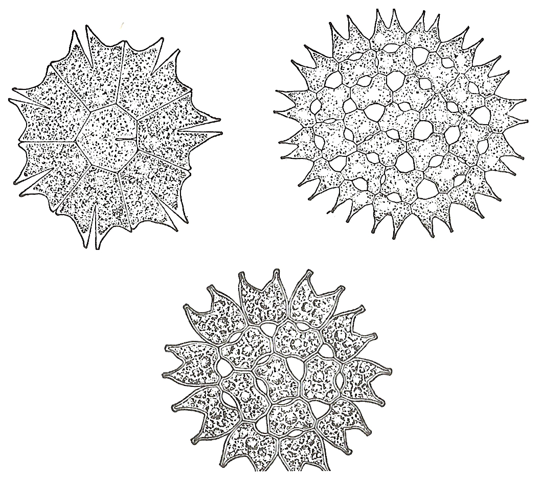 Three different species of Pediastrum. (From Brown, The Plant Kingdom, Ginn, 1935 (Brown 1935)) Note that the two on the right have five-fold symmetry.